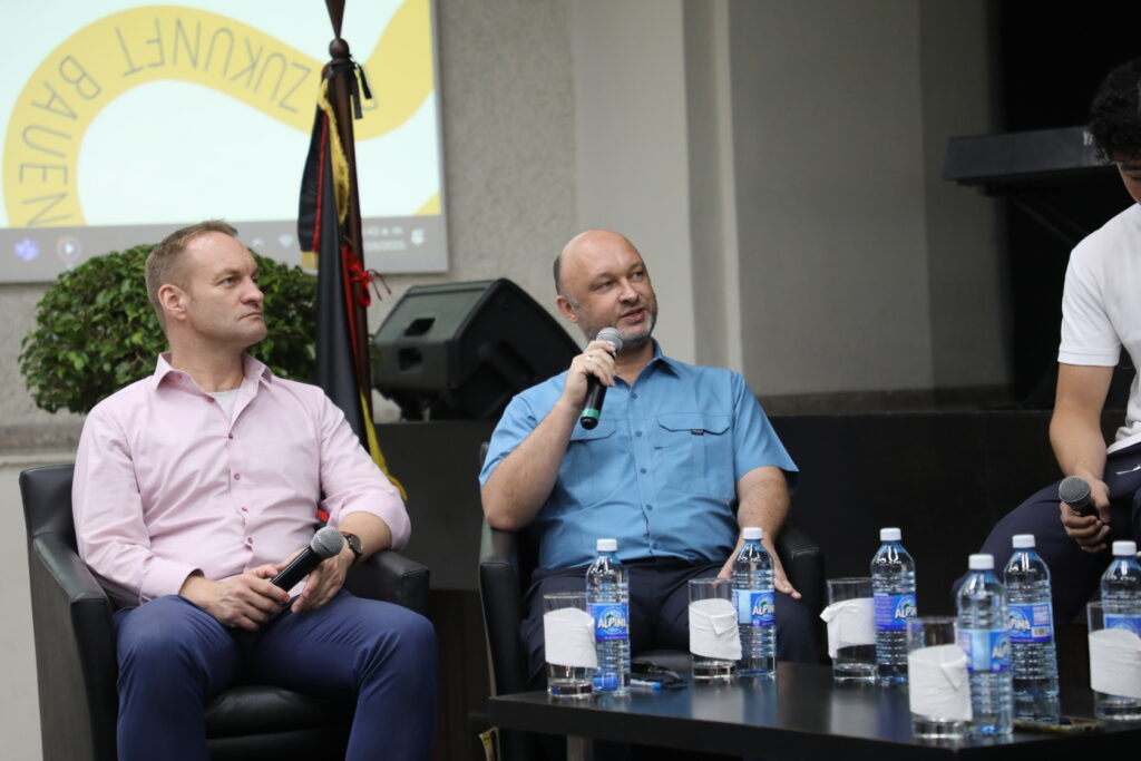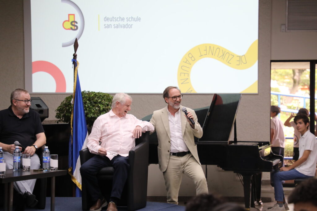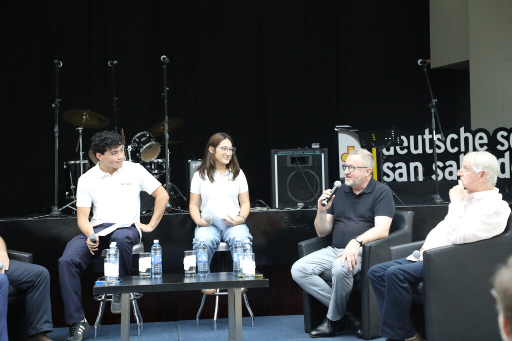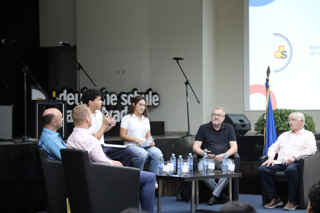 Die Schülerinnen und Schüler der 9. Klasse bis zur Oberstufe nahmen an einer bildungsorientierten Talkshow mit besonderen Gästen teil: Herr Friedo Sielemann, Botschafter der Bundesrepublik Deutschland in El Salvador, Herr Nicolaj Diestelbarth, Kulturattaché, Herr Bernd Grabs, ehemaliges Mitglied des Vorstandes, und Herr Alexander Wolf, aktuelles Mitglied des Vorstandes der AEA.